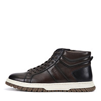 Практичные кожаные ботинки черного цвета с коричневыми вставками. Пара утеплена мягким ворсином. Гибкая подошва из материала ТЭП обеспечивает хорошее сцепление с поверхностью. Модель с удобной застежкой на молнию и трендовой высокой шнуровкой.