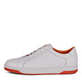 Универсальные белые кожаные кеды с акцентной отделкой подошвы. Комфорт стоп обеспечивают текстильная подкладка и стелька из нежной кожи шевро. Гибкая подошва из резины гарантирует оптимальную поддержку. Пара отлично впишется в образы с брюками, шортами и джинсами.