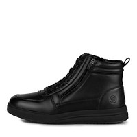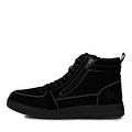Черные мужские кеды с контрастной прострочкой. Пара изготовлена из ворсистого нубука и утеплена мягкой натуральной шерстью. Высокая резиновая подошва поддерживает стопы в оптимальном положении и гарантирует хорошее сцепление с поверхностью. Модель со шнуровкой также дополнена удобной застежкой на молнию. Утолщенный ворот и петля на голенище для удобства надевания.