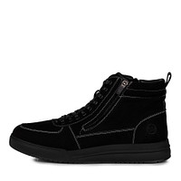 Черные мужские кеды в лаконичном дизайне. Пара изготовлена из гладкой натуральной кожи и утеплена мягкой натуральной шерстью. Высокая резиновая подошва поддерживает стопы в оптимальном положении и гарантирует хорошее сцепление с поверхностью. Модель со шнуровкой также дополнена удобной застежкой на молнию. Утолщенный ворот и петля на голенище для удобства надевания.