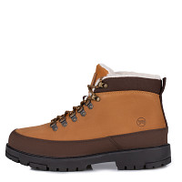 Эффектные черные мужские ботинки выполнены в дизайне туристической обуви. Верх выполнен из нубука и усилен прочной вставкой из резины. Пара утеплена мягкой натуральной шерстью. Высокая рифленая подошва из материала ТЭП гарантирует идеальное сцепление с покрытием и обеспечивает устойчивость с каждым шагом. Модель со шнуровкой и практичной петлей на голенище для удобства надевания обуви.