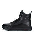 Футуристичные высокие кеды черного цвета. Верх выполнен из гладкой натуральной кожи. Шерстяные подкладка и стелька обеспечивают комфортную терморегуляцию стоп. Широкая подошва из ТЭП отличается легкостью, морозоустойчивостью и хорошим сцеплением с поверхностью. Модель фиксируется шнуровкой и удобно застегивается на молнию.