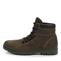 Мужские ботинки из зимней коллекции выполнены из бархатистого плотного нубука цвета хаки. Такая пара идеально завершит любой повседневный образ. Подкладка и съемная мягкая стелька из густой шерсти не даст ногам  замерзнуть. Широкая подошва с высоким рантом отвечает за улучшенное сцепление с любой поверхностью. Отделка канта из черной кожи и шнурки в тон.
