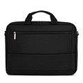 Лаконичный черный портфель. Верх и подкладка изготовлены из прочного текстиля. Портфель вмещает документы формата А4 и ноутбук среднего размера. Детали: застежка на молнию, съемный плечевой ремень, практичные карманы для мелочей.