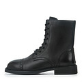 Высокие чёрные ботинки с внутренней отделкой из ворсина выполнили из гладкой натуральной кожи. Модель с боковой молнией и шнуровкой поставили на широкую подошву. Женские ботинки - стильный выбор для холодной погоды и уверенной походки.