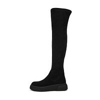 Эффектные черные ботфорты. Комбинированный верх сочетает современную искусственную и гладкую кожу из спилка. Пара утеплена мягким ворсином. Высокая подошва из материала ТЭП отличается износостойкостью и хорошим сцеплением с поверхностью.