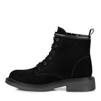 Базовые черные ботинки с верхом из гладкой натуральной кожи. Модель с мягкой подкладкой и стелькой из густого натурального меха обеспечивает тепло и комфорт стоп. Пара со шнуровкой и удобной застежкой на молнию. Плотная подошва из гибкой и прочной резины гарантирует отличное сцепление с поверхностью.