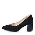 Модельные туфли лодочки из велюра составят удачный ансамбль со строгими и полустрогими образами. Их можно надевать в офис, на деловую встречу, свидание. Модель выполнена в черном цвете, имеет классический фасон с заостренным носком. Изюминка туфель – устойчивый каблук квадратной формы с продольными бороздками, высотой 7 см.