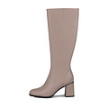 Эффектные бежевые сапоги на устойчивом каблуке. Верх выполнен из гладкой натуральной кожи. Комфортный микроклимат пары обеспечивают подкладка и стелька, изготовленные из мягкого ворсина.  Сапоги отлично впишутся в образы с платьями, юбками и укороченными брюками. Застежка на молнию, эластичная вставка на голенище.