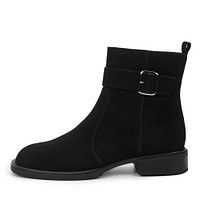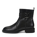 Лаконичные черные ботинки с декоративной пряжкой. Материал верха - гладкая кожа из спилка. Подкладка и стелька утеплены мягким ворсином. Модель надежно фиксируется удобной молнией. Утолщенная подошва из термопластичной резины отличается устойчивостью к морозам и хорошим сцеплением с поверхностью.