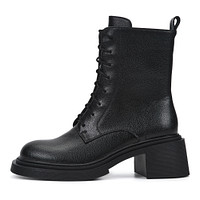 Эффектные коричневые ботильоны с высокой шнуровкой. Материал верха - текстурированная кожа из спилка. Пара утеплена ворсином. Утолщенная подошва из материала ТЭП и блочный каблук высотой 6,5 см грамотно распределяют нагрузку на стопы и обеспечивают устойчивость.