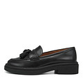 Черные лоферы выполнены из прочной кожи из спилка. Из такого же материала выполнили широкую перемычку с короткими кисточками. Модель на гибкой подошве ТЭП одинаково хорошо завершит и повседневный образ для городских улиц, и комплект для офиса с нестрогим дресс-кодом.