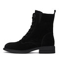 Минималистичные черные ботинки. Верх выполнен из бархатистого спилка. Пара утеплена ворсином. Утолщенная резиновая подошва обеспечивает устойчивость на любой поверхности.