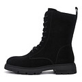 Лаконичные черные ботинки с высокой шнуровкой. Верх выполнен из прочного спилка с бархатистой фактурой. Стелька утеплена мягким ворсином. Высокая резиновая подошва с выраженными протекторами отличается прочностью и хорошим сцеплением с поверхностью. Модель с удобной застежкой на молнию.