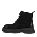 Универсальные черные ботинки из бархатистого спилка. Модель с подкладкой и стелькой, выполненными из мягкого ворсина. Рифленая резиновая подошва отлично поддерживает стопы и обеспечивает устойчивость на любых покрытиях. Пара со шнуровкой, застежкой на молнию и практичной петлей на голенище.