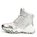 Серебристые дутики футуристического дизайна станут акцентом всего образа. Модель выполнена из непромокаемого текстиля и гладкой кожи из спилка. Подкладка и стелька утеплены ворсином. Массивная подошва из резины отличается прочностью и надежным сцеплением с поверхностью.