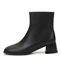 Базовые бежевые ботильоны с трендовым квадратным мысом. Материал верха - мягкая кожа из спилка. Подкладка и стелька утеплены ворсином. Утолщенная резиновая подошва обеспечивает надежное сцепление с любой поверхностью. Небольшой устойчивый каблук высотой 4,9 см визуально вытягивает силуэт и грамотно распределяет нагрузку на стопы.