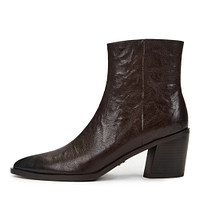 Лаконичные черные ботильоны с трендовым эффектом мятой кожи. Верх выполнен из нежной шевро для комфорт посадке пары на ноге. Утолщенная резиновая подошва отличается прочностью и хорошим сцеплением с поверхностью. Устойчивый скошенный каблук высотой 7 см грамотно распределяет нагрузку на стопы.