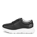 Минималистичные черные кроссовки для ежедневного комфорта. Верх выполнен из гладкой кожи из спилка с влагонепроницаемым покрытием. Подкладка и стелька обеспечивают комфорт стоп в процессе носки. Объемная белая подошва из полиуретана отличается гибкостью и не утяжеляет обувь в спортивном стиле.