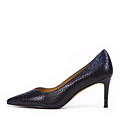 Акцентные туфли-лодочки с верхом из натуральной кожи с выделкой «под змею». Подкладка и стелька изготовлены из нежной кожи шевро. Модель с заостренным мысом и на тонком каблуке высотой 55 мм. Черные туфли отлично дополнят образы в стиле casual, добавив аутфиту элегантности.