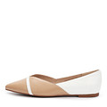 Комфортные элегантные туфли на плоской подошве. Модель сделана из кожи тонкой выделки, поэтому изящно смотрится на ноге. Акцент этой пары – необычная расцветка верха: это комбинация белой кожи и евро оттенка молочного шоколада. Горизонтальная белая полоска в передней части придает туфлям изящный вид.