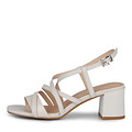 Модельные летние босоножки для утонченных и элегантных леди. Обувь полностью выполнена из натуральной лаковой кожи, имеет открытый носок и пятку, застежку-пряжку, устойчивый квадратный каблук высотой 6,5 см. Дизайн верха – широкая полоса с переплетенными узкими ремешками. Отличный вариант для классических и романтичных образов лета.