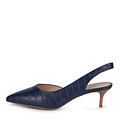 Подыскиваете туфли для офиса или официальных встреч, мероприятий? Рекомендуем элегантную модель в классическом стиле. Обувь имеет закрытый заостренный носок, открытую пятку с задником на резинке и средний каблучок-шпильку 5,1 см. Материал верха – натуральная кожа спилок синего цвета с фактурной поверхностью «кирпичик».