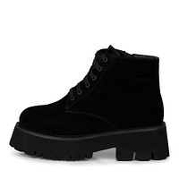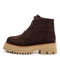 Ультралегкие женские ботинки выполнены из мягкого натурального спилка оттенка какао, Широкая бежевая подошва из ЭВА придает  невесомости паре, а высокий протектор улучшает сцепление с любой поверхностью. Подкладка из густой стриженной шерсти белого цвета придаст ощущение уюта и тепла ногам. В качестве декора контрастный рант с глянцевым блеском.