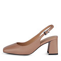 Базовые бежевые кожаные туфли-слингбэки. Комфорт стоп и идеальную посадку обуви обеспечивают кожаная подкладка и стелька, выполненная из нежной кожи шевро. Широкий каблук высотой 70 мм формирует оптимальную поддержку. Прочная подошва из тунита, застежка на классический замок с пряжкой.