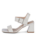 Молочные босоножки на широком каблуке с трендовым квадратным мысом.  Верх изготовлен из лакированной кожи. Кожаная подкладка и стелька из нежной кожи шевро обеспечивают комфорт стоп в течение всего дня. Фигурный каблук высотой 65 мм обеспечивает равномерно распределение нагрузки по стопе. Широкие ремешки надежно фиксируют пару на ноге.