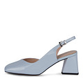 Минималистичные кожаные голубые туфли-слингбэки. Комфорт стоп обеспечивают кожаная подкладка и стелька, выполненная из нежной кожи шевро. Фигурный каблук высотой 70 мм гарантирует оптимальную поддержку. Пара отлично впишется в образы с брючными костюмами, воздушными платьями и юбками.