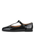 Балетки из лакированной кожи чёрного цвета. Модель с круглым мысом на рельефной подошве. Застежка на узкий ремешок с акцентной пряжкой.