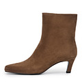Женственные коричневые ботильоны. Верх выполнен из бархатистого велюра. Подкладка и стелька утеплены мягким ворсином. Подошва из тунита гарантирует оптимальную поддержку стоп. Тонкий скошенный каблук высотой 6 см устойчив и грамотно распределяет нагрузку.