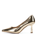 Акцентные золотые кожаные туфли. Подкладка и стелька из мягкой натуральной кожи формируют комфортную посадку. Каблук высотой 85 мм гарантирует оптимальное распределение нагрузки по стопе. Туфли идеально дополнят образы с джинсами, юбками, платьями.