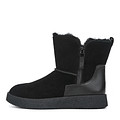 Базовые утепленные угги черного цвета. Пара выполнена из мягкого ворсистого спилка, пяточная часть укреплена плотной натуральной кожей. Угги утеплены натуральной шерстью, гарантирующей комфорт стоп в любую погоду. Модель с широким голенищем дополнена удобной застежкой на молнию. Пара отлично дополнит образы в любом стиле.