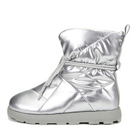 Акцентные женские дутики в перламутровом оттенке бежевого. Верх выполнен из непромокаемого стеганого текстиля и дополнен функциональной шнуровкой. Пара утепленная натуральной шерстью для оптимальной терморегуляции стоп. Прочная резиновая подошва обеспечивает отличное сцепление на различных поверхностях.