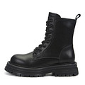 Актуальные черные ботинки на холодный сезон. Материал верха - гладкая кожа с покрытием, которое дополнительно защищает ноги от промокания. Подкладка и стелька утеплены мягким ворсином. Высокая резиновая подошва с выраженными протекторами отличается прочностью и устойчивостью на любых покрытиях. Модель фиксируется шнуровкой и удобной застежкой на молнию.