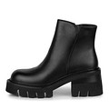 Стильные черные ботильоны с графичным дизайном. Верх выполнен из мягкой кожи из спилка. Подкладка и стелька утеплены натуральной шерстью для оптимальной терморегуляции на улице и в помещении. Высокая резиновая подошва с выраженными протекторами обеспечивает надежное сцепление с любой поверхностью. Устойчивый каблук высотой 7,5 см грамотно распределяет нагрузку на стопы.