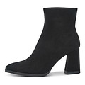 Утонченные черные ботильоны из деликатного велюра. Подкладка и стелька утеплены мягким ворсином. Утолщенная резиновая подошва отличается прочностью и хорошим сцеплением с любой поверхностью. Фигурный устойчивый каблук высотой 8,5 см грамотно распределяет нагрузку на стопы и визуально вытягивает силуэт.