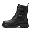 Актуальные черные ботинки в байкерском стиле. Верх выполнен из гладкой кожи из спилка с влагонепроницаемым покрытием и декорирован ремешками и пряжками. Подкладка и стелька из натуральной шерсти поддерживают оптимальную температуру внутри обуви на улице и в помещении. Высокая резиновая подошва с выраженными протекторами отличается прочностью и надежным сцеплением с любой поверхностью. Модель фиксируется шнурками и удобно застегивается на молнию.