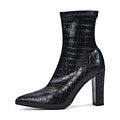 Стильные черные ботильоны с тиснением под крокодила. Верх выполнен из современной искусственной кожи, за которой легко ухаживать. Подкладка и стелька утеплены мягким ворсином, обеспечивая комфорт и тепло в прохладную погоду. Резиновая подошва отличается прочностью. Широкий устойчивый каблук высотой 10 см грамотно распределяет нагрузку на ноги.