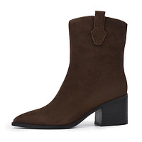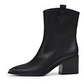 Лаконичные черные ботильоны с декоративным ремешком в стиле ковбойской обуви. Материал верха - влагонепроницаемая кожа из спилка. Мягкие подкладка и стелька из ворсина обеспечивают тепло и комфорт в процессе носки. Резиновая подошва отличается прочностью. Широкий каблук высотой 6,8 см устойчив и визуально вытягивает силуэт.