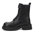 Минималистичные черные ботинки с высокой шнуровкой. Материал верха - матовая кожа из спилка. Подкладка и стелька утеплены натуральной шерстью для оптимальной терморегуляции стоп. Высокая подошва из материала ТЭП отличается легкостью, морозоустойчивостью и хорошим сцеплением в любой поверхностью. Модель с удобной застежкой на молнию.