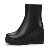 Эффектные велюровые ботильоны на танкетке в универсальном черном цвете. Подкладка и стелька из натурального меха сохраняют тепло внутри пары даже при сильном морозе. Высокая подошва из материала ТЭП отличается легкостью, прочностью и хорошим сцеплением с поверхностью.