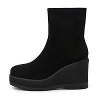 Эффектные черные ботильоны на танкетке. Верх выполнен из гладкой натуральной кожи. Подкладка и стелька из натурального меха сохраняют тепло внутри пары даже при сильном морозе. Высокая подошва из материала ТЭП отличается легкостью, прочностью и хорошим сцеплением с поверхностью.