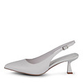 Изящные кожаные молочные туфли-слингбэки. Подкладка выполнена из натуральной кожи, стелька изготовлена из нежной кожи шевро. Застежка на классический замок с пряжкой. Фигурный каблук 57 мм обеспечивает равномерное распределение нагрузки по стопе.