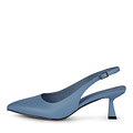Изящные кожаные голубые туфли-слингбэки. Подкладка выполнена из натуральной кожи, стелька изготовлена из нежной кожи шевро. Застежка на классический замок с пряжкой. Фигурный каблук 57 мм обеспечивает равномерное распределение нагрузки по стопе.
