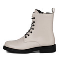 Женские ботинки выполнены из гладкой мягкой кожи оттенка «белый шепот» и станут акцентом в любом повседневном образе. Дуэтом выступают контрастная шнуровка с матовыми металлическими люверсами и износостойкая подошва в тон. Подкладка из ворсина способствует комфортной температуре внутри обуви. Крупная кожаная петля на голенище служит для удобства надевания.