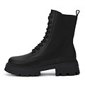 Минималистичные черные ботинки с высокой шнуровкой. Верх выполнен из практичной кожи из спилка. Подкладка и стелька утеплены натуральной шерстью. Удобная боковая молния ускоряет процесс фиксации пары. Высокая резиновая подошва с выраженными протекторами обеспечивает надежное сцепление с любой поверхностью.