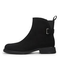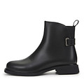 Базовые черные ботинки с декоративным ремешком на заднике. Материал верха - матовая кожа из спилка. Пара утеплена мягким ворсином. Утолщенная резиновая подошва отличается прочностью и хорошим сцеплением с поверхностью.